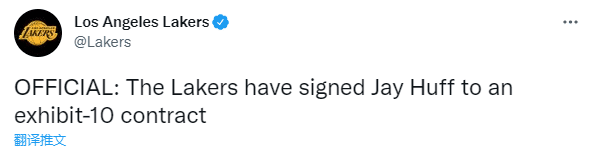 来源:JRS直播网07-28 10:12JRS直播网07月28日讯 ,湖人官宣再签一人,湖人官方宣布,球队正式与中锋杰伊-胡夫签下了一份Exhibit-10合同,这是一份一年无保障训练营合同,湖人训练营大名单增至19人,仅剩最后一个名额。
