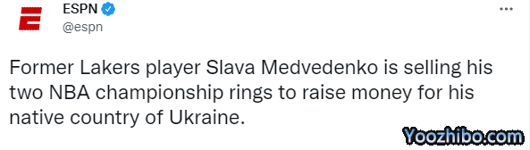来源:JRS直播网07-25 09:19JRS直播网07月25日讯 ,据美媒ESPN报道,前湖人总冠军成员斯拉瓦-梅德维登科正在出售他的两枚总冠军戒指,目的是为他的祖国乌克兰筹集资金;他跟随科比和奥尼尔夺得两次总冠军,备受科比的喜爱