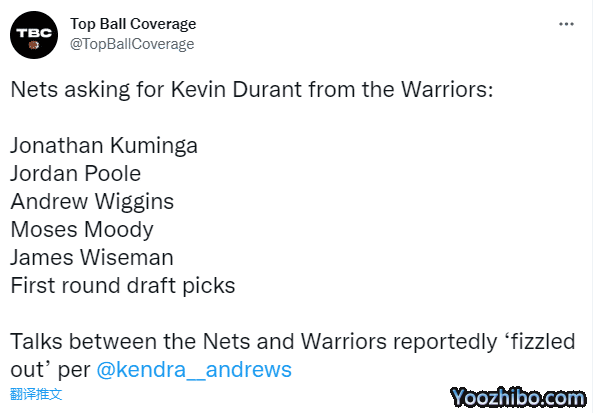 杜兰特1换6遭拒!篮网向勇士要价曝光 索要维金斯等5名球员太疯狂