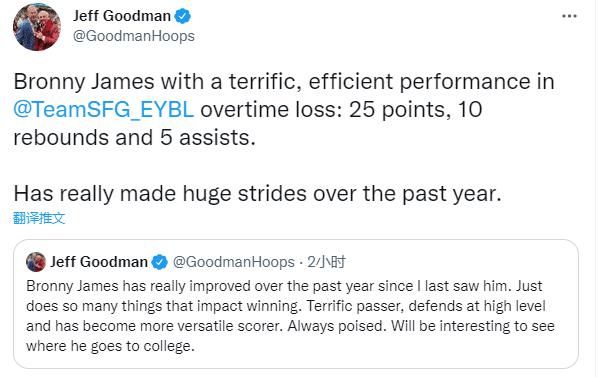 美记者Jeff Goodman发推写道:自从我上次见到他以来,布朗尼在过去一年里确实进步了。只是做了很多影响比赛的事情。出色的传球,高水平的防守,并且已经成为一名全能的得分手;看看他将在哪里上大学会很有趣。虽然加时输球,但布朗尼表现出色且高效,过去一年确实取得了巨大的进步。