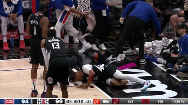 鲍威尔血染赛场且缝针:面部遭肘击痛苦扭动 哈登站其身旁满脸担忧