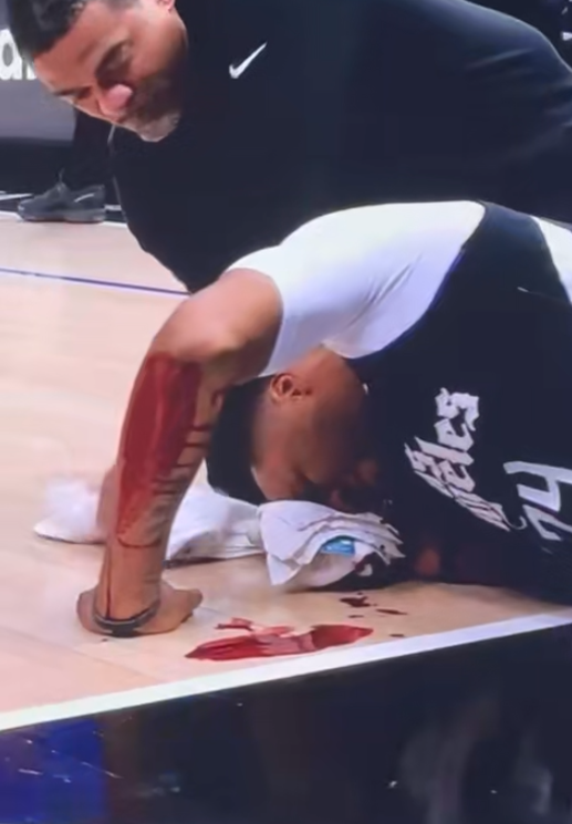 末节5分12秒,在禁区拼抢篮板时,鲍威尔的面部惨遭杜伦肘击,鲍威尔捂着面部倒地不起,面部被打出血,鲜血染红球场,鲍威尔的手臂上全是血;哈登第一时间走过来,十分担忧鲍威尔;乔治站在一旁同样满脸担忧,之后小卡和泰伦-露也围过来,鲍威尔缓了一段时间后,哈登和乔治拉起他。