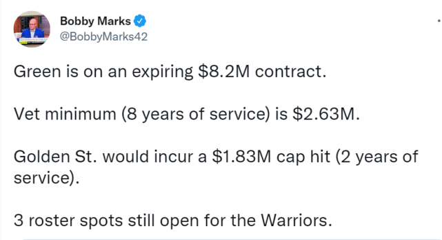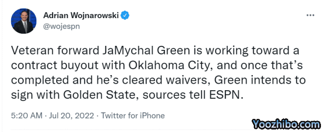 来源:JRS直播网07-20 10:47JRS直播网07月20日讯 ,据名记Woj报道,老将贾麦考-格林将和雷霆买断合同,度过澄清期后计划加盟勇士。在此前的一笔交易中,贾麦考-格林被掘金交易到雷霆,这位32岁的老将无意为重建球队效力,双方达成买断,也给了格林冲击冠军的机会。勇士为格林提供1年263万美元的老将底薪。