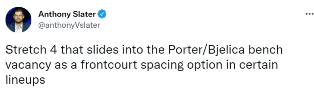 勇士记者斯雷特点评道:“空间型四号位,在特定的阵容中能作为前场拉开空间的选择,填补失去波特和别利察的板凳阵容。”虽然贾麦考-格林上赛季的三分命中率只有26.6%,但他的生涯三分命中率能达到36.6%,2020-21赛季的三分命中率是39.9%。