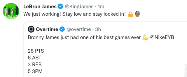 来源:JRS直播网07-19 10:07JRS直播网07月19日讯 ,美媒Overtime晒出了布朗尼在最近一场NikeEYB的比赛数据:28分6助攻3篮板5三分,并称赞:“布朗尼打出了他有史以来最好的一场比赛。”詹姆斯转发并写道:“我们只是在努力,保持低调,保持专注!”