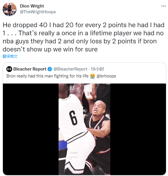 值得一提的是,詹姆斯42+16引爆球馆,Dion Wright瞪大眼睛拼命防守也无法限制詹姆斯,他的表情被称为用生命在防守;对于美媒的嘲讽,Dion Wright本人回应:詹姆斯轰下40分,我则是拿到20分,这真是一个千载难逢的机会,我们没有NBA球员,可他们有2名NBA球员却仅赢2分,若没有勒布朗,我们肯定能赢。