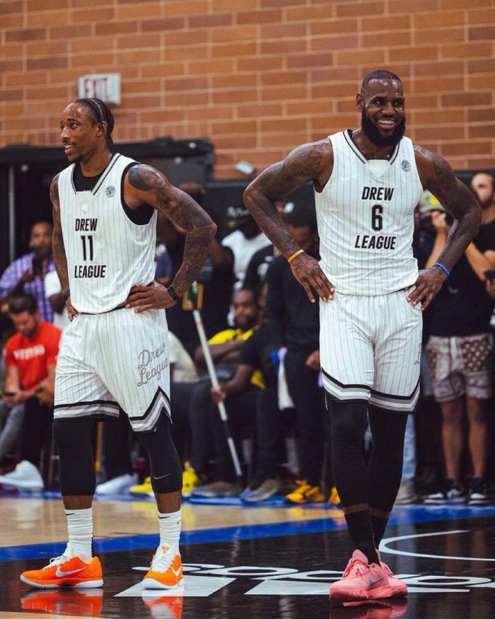 詹姆斯晒出多张参加德鲁联赛的赛场照,身穿德鲁联赛6号球衣,遮挡该联赛赞助商的广告,晒出自己与德罗赞神同步双手扶着膝盖的同框合影,还有老詹飞身暴扣、发狠霸气表情以及全场球迷都拿着手机为他拍照等画面。