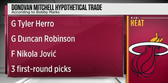 对于米切尔的潜在交易,薪资专家Bobby Marks认为热火可以把希罗、邓肯-罗宾逊、约维奇和三个首轮签交易到爵士,6换1引援米切尔。