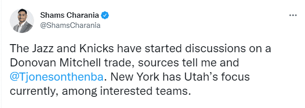 目前爵士正在尝试交易米切尔,他们已经跟数支球队进行了谈判,但目前纽约尼克斯领跑,双方在过去的24小时里谈论了一个交易框架。