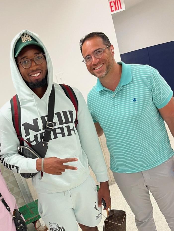 不久前,有球迷在飞机上偶遇米切尔,而且双方合影;当米切尔被询问是否会加盟尼克斯,前者回复:我们会知道的。