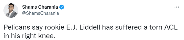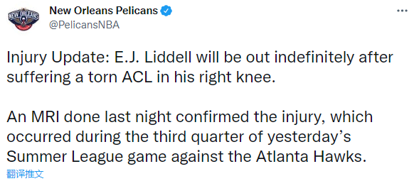 在此前鹈鹕和老鹰比赛第三节,里德尔遭遇明显的右膝受伤,由于右腿无法承受任何重量,他被搀扶离场,受伤离场前,里德尔上场12分钟,3投3中拿到6分4篮板2助攻,夏联首秀则是6投1中仅仅拿到2分4篮板;如今他的核磁检查结果出炉,惨遭十字韧带撕裂的大伤。