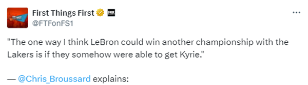 目前湖人43胜33负排在西部第9位,未来詹姆斯的夺冠前景如何?名嘴Chris Broussard表示:我认为詹姆斯不会再夺冠。只有把欧文招募到洛杉矶,他才有可能再夺一冠。而这件事我觉得很难发生,因为独行侠现在确实也打得很好,欧文和独行侠之间都非常满意。