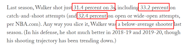 从位置上来看,沃克可能成为蒙克的接班人,他努力成为一名双能卫,但他确实还需要继续进步。上赛季,沃克三分命中率只有31.4%,其中,接球即射三分的命中率是33.2%,空位或大空位的三分命中率只有32.4%。毫无疑问,