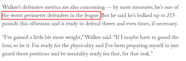 沃克表示自己现在每天6点起床开始三项训练,两项在球场上,一项在力量房。上赛季,他的防守指标也让人担忧。,但他自曝这个休赛期增重到215磅(原体重204磅),大概是增加了5公斤左右,完全有能力防三号位甚至四号位的球员。