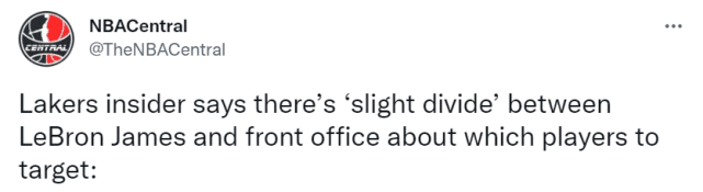 来源:JRS直播网07-09 09:57JRS直播网07月09日讯 ,据湖人记者Jovan Buha报道,球队正寻求在交易市场上提升阵容实力,但在球队的引援目标上,超级球星詹姆斯和湖人高管存在一定的分歧。詹姆斯更希望得到前队友欧文,而湖人管理层的一些内部人士更想从步行者换来希尔德和特纳。