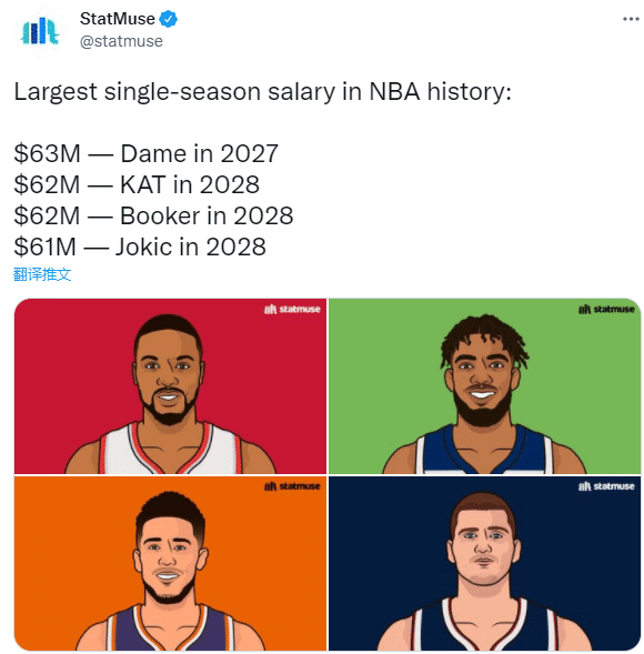 2、利拉德将成为史上单赛季球员薪水第一人,美媒StatMuse统计,利拉德26-27赛季年薪6330万美元,历史年薪第一人;唐斯和布克27-28赛季年薪6200万美元,约基奇27-28赛季年薪6100万美元。