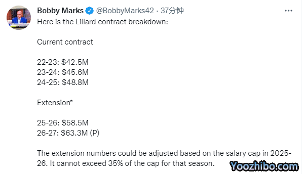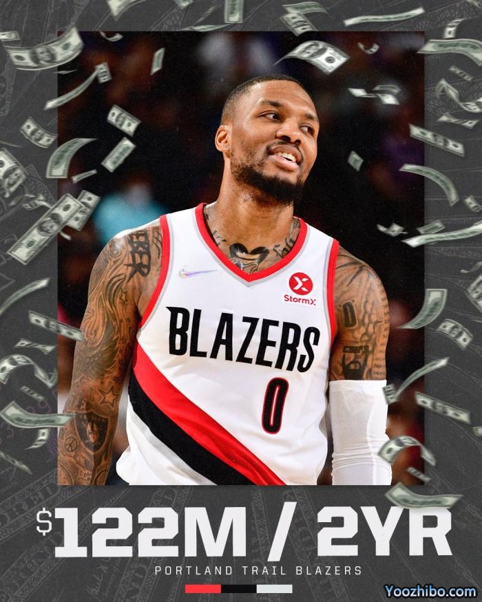 利拉德提前续签2年1.22亿美元超级顶薪,薪资专家Bobby Marks详解利拉德未来5年的具体薪资:2022-23赛季4250万美元、2023-24赛季4560万美元、2024-25赛季4880万美元、2025-26赛季5850万美元和2026-27赛季6330万美元,26-27赛季拥有球员选项。