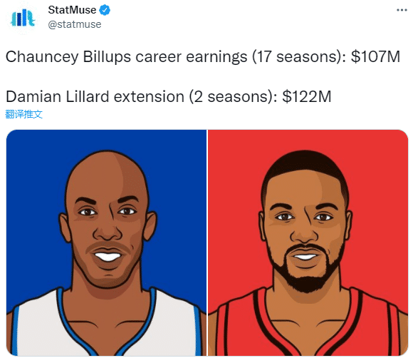 美媒StatMuse对比开拓者主帅比卢普斯和利拉德的薪资,比卢普斯生涯17个赛季总收入1.07亿美元,利拉德2年提前续约合同1.22亿美元;换言之,利拉德2年新合同超主帅生涯总收入。