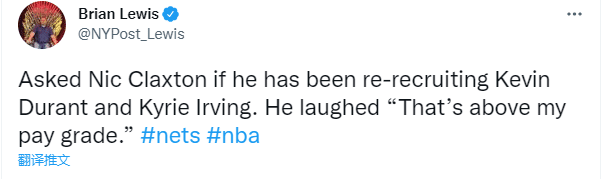 当被问及是否有在说服杜兰特、欧文留队时,克拉克斯顿打趣道:这超过了我的工资职责范围。在我完成续约后,他们俩都给我发了消息。