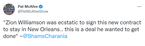 Shams在节目中表示:锡安-威廉森欣喜若狂地签下了这份留在鹈鹕的续约合同,消息人士告诉我,锡安的顶薪合同中有保护条款,但这(依旧)是他想完成的合同,只要他保持健康,继续发挥,想要达到合同里的那些标准不成问题。