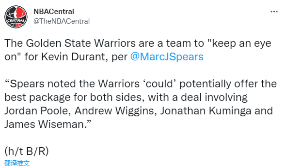 据名记Marc Spears报道,勇士是“密切关注”杜兰特情况的球队,勇士是杜兰特的完美下家。如果篮网继续拖下去,勇士确实能够给出很好的交易方案;他们可能会给出令双方都满意的筹码,包括普尔、维金斯、库明加和怀斯曼。