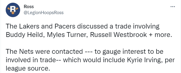 据美媒Legion Hoops报道,湖人、步行者和篮网商讨三方大交易,涉入其中的球员有威少、欧文、特纳和巴迪-希尔德。