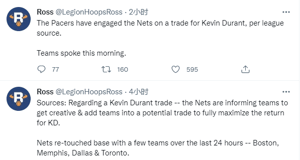 Legion Hoops还报道,步行者已经向篮网报价杜兰特。