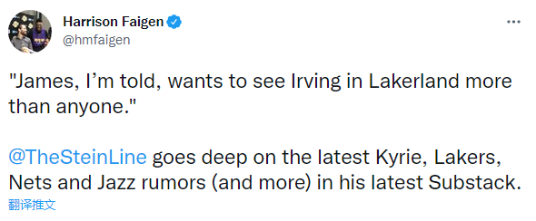 名记Marc Stein表示,我相信篮网与湖人已讨论过欧文交易,我知道欧文这周一直待在洛杉矶,但这并非我的信心来源。这源于内部的反复传言:詹姆斯正在全力支持欧文加入湖人;据我被告知的情况,詹姆斯比任何人都更想在湖人看到欧文。
