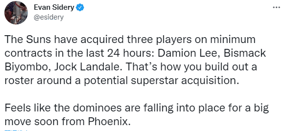 NBA记者Evan SIdery发推写道:太阳队在过去 24 小时内以老将底薪合同获得了三名球员:达米恩-李、比永博和乔克-兰代尔,这就是太阳围绕潜在的交易引援超巨(杜兰特)的方式, 感觉就像多米诺骨牌即将从凤凰城开始大动作。