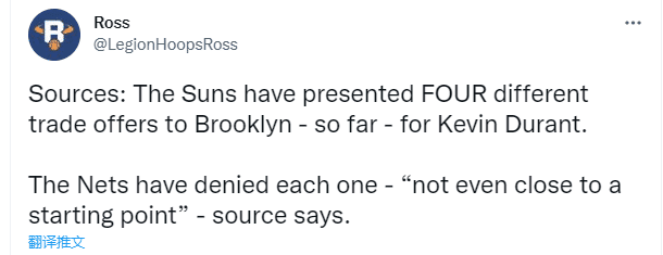 众所周知,太阳是杜兰特最心仪的下家之一,不过目前太阳手里的筹码很难打动篮网,据美媒Legion Hoop报道,篮网已经拒绝了太阳四份有关杜兰特的交易报价,消息人士透露,篮网拒绝的非常果断,双方甚至都没深入讨论,他们的谈判甚至都没接近起点就结束了。