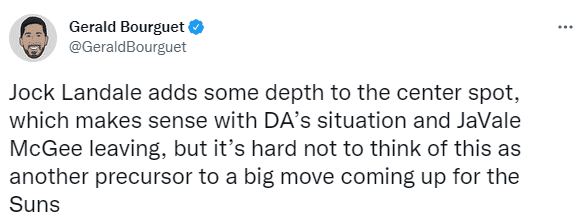 太阳记者Gerald Bourguet发推:兰代尔为中锋位置增加了一些深度,这在艾顿的情况和麦基离开的情况下是有道理的,这是太阳队酝酿大动作的另一个前兆。