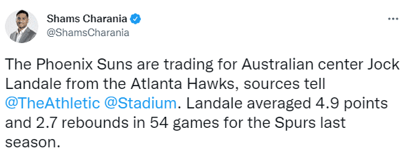 不久前,太阳和老鹰达成1换1的交易,用现金换来澳大利亚中锋乔克-兰代尔,此前兰代尔在穆雷交易中被送到马刺,如今他又被交易太阳,2021-22赛季,兰代尔为马刺出战54场常规赛,场均得到4.9分2.6篮板。