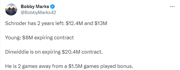 薪资专家Bobby Marks表示,施罗德的合同还有2年,本赛季1240万美元和下赛季1300万美元,杨的薪水为800万美元,其中有不太可能得到的50万美元奖金;丁威迪合同年薪为2040万美元,他只要再打2场比赛就能获得150万美元的奖金。