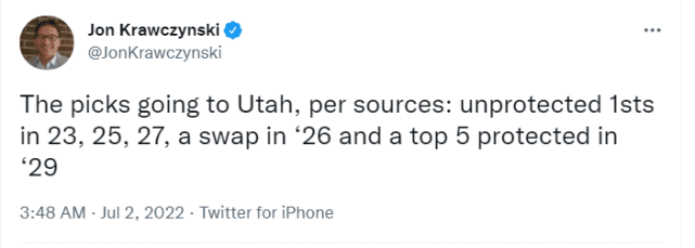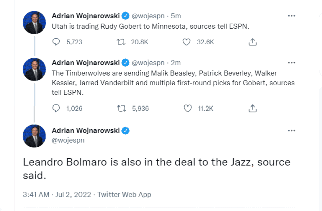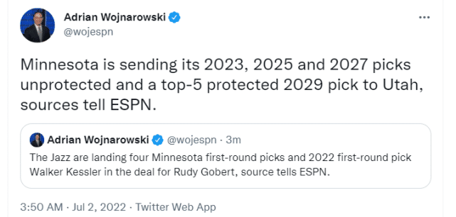 来源:JRS直播网07-02 12:07JRS直播网07月02日讯 ,据名记Woj报道,森林狼和爵士达成了一笔重磅10换1交易,森林狼将马利克-比斯利、贝弗利、凯斯勒、范德比尔特、博尔马罗和4个首轮签送往爵士,得到了三届最佳防守球员鲁迪-戈贝尔,具体的4个签是2023年、2025年和2027年的首轮,均为无保护,2029年是前五保护。后续报道称,森林狼还获得2026年首轮互换权。