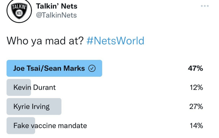 杜兰特申请离队,对于篮网、NBA联盟都是有很大的影响力,这其中有外媒发起投票,称杜兰特申请离队,对谁最不满?根据票数显示,有接近一半的球迷选择篮网老板蔡崇信和总经理马克斯。对于欧文不满的也有27%的票数,至于杜兰特本人和疫苗的原因,占比都在12-14%之间。