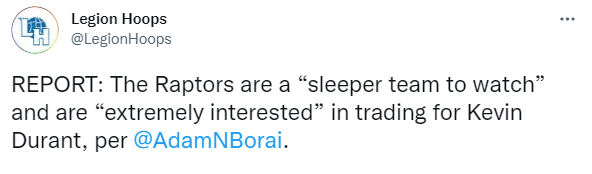 美记者Adam Borai表示猛龙队是一支“值得关注的沉睡球队”,他们非常有兴趣交易得到凯文-杜兰特。