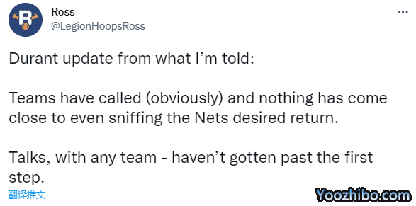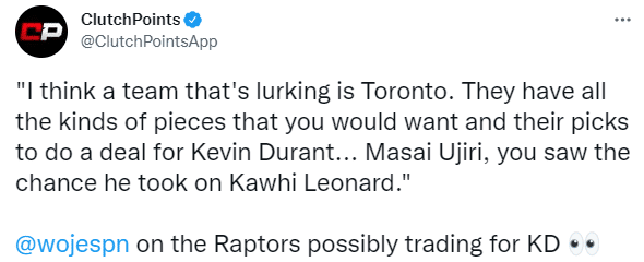 ESPN名记沃纳罗斯基在节目中表示猛龙一直“潜伏”在杜兰特的交易讨论之中,表示:我认为多伦多猛龙是一支潜伏的球队,他们有篮网交易杜兰特想要的筹码和选秀权;你们也看到乌杰里曾通过交易得到莱昂纳德。