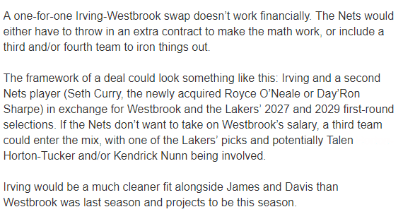 Sam Amick还表示,若篮网不想要威少的4700万美元大合同,他们可以通过三方交易,可能霍顿-塔克和纳恩也会被放在交易之中。