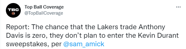 Sam Amick表示湖人交易浓眉的机会为零,他们不会参与杜兰特的交易之中;此前A-史密斯透露,篮网对杜兰特的要价是至少两个全明星球员;很明显,湖人没有筹码也不愿意把浓眉加入杜兰特的争夺战中。