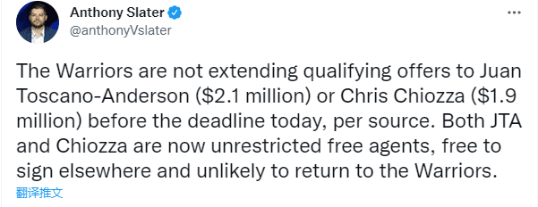 据勇士记者Anthony Slater报道,勇士没有在截止日前向安德森(210万美元)或切奥扎(190万美元)提供资质报价,两人成为完全自由球员;Anthony Slater还表示,两人现在都是不受限制自由球员,可以自由签约其他球队,而且他们不太可能回到勇士队。