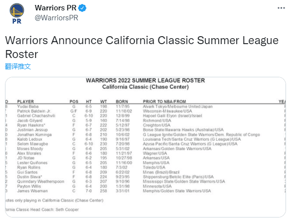 勇士官方公布了征战新赛季夏季联赛的球员名单,怀斯曼、库明加、穆迪、Yudai Baba、小鲍德温、查查什维利、吉利亚德、勒杜、马武贝、莫拉莱斯、JD Notae、奎尼诺斯、罗林斯、桑托斯、斯莱瓦、威瑟斯彭和威利斯等人
