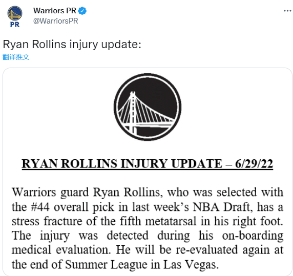 勇士官方宣布次轮秀瑞安-罗林斯遭遇右脚第五跖骨应力性骨折伤病,他的伤病是在接受体检时发现的,他将在夏季联赛结束后再次接受评估。