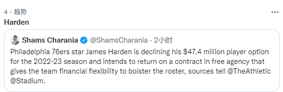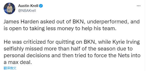 76人随队记者Austin Krell发推:哈登申请交易离开布鲁克林,在加盟76人后他打得确实不够好,但他愿意降薪来帮助自己的球队。他因为离开篮网被受到批评,而欧文因为个人的自私决定错过了大半个赛季,然后试图迫使篮网与其续约一份顶薪合同。