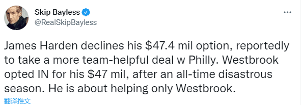 Skip嘲讽威少,发推:詹姆斯-哈登拒绝了他价值4740万美元的球员选项,据报道他将与76人达成一项对球队更有帮助的续约合同。在经历了一个空前灾难性的赛季后,威少选择执行他4700万美元的球员选项,他只想着要帮助威斯布鲁克。