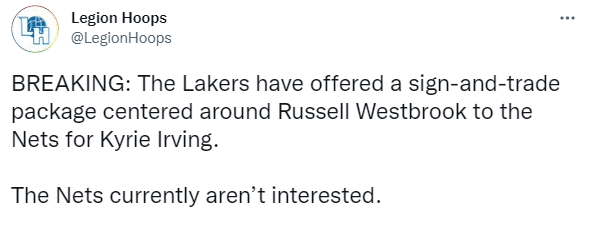 据沃纳罗斯基报道,目前除湖人外,没有已知的球队计划通过先签后换的方式得到欧文;另一方面,篮网对湖人队提供的以威少为主体的交易筹码不感兴趣。