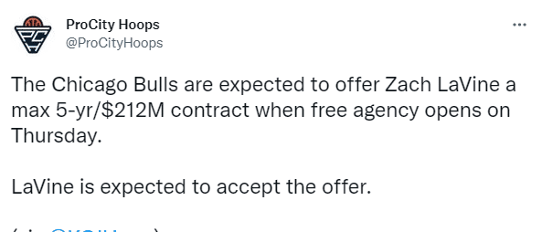 据公牛记者K.C.Johnson报道,在自由市场开启之后,预计公牛将正式给拉文提供一份5年2.12亿美元的顶薪合同,预计拉文将接受这一份大合同。