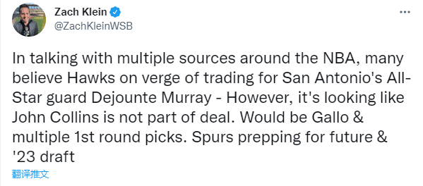 据NBA记者Zach Klein报道,多个消息来源指出,老鹰目前接近于交易得到马刺全明星后卫德章泰-穆雷;然而,约翰-科林斯并不是交易的一部分,交易筹码包括加里纳利和未来多个首轮选秀权。