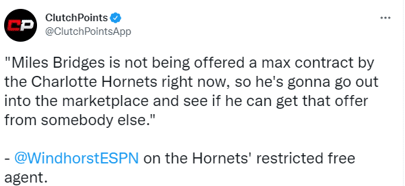 12、据名记Brian Windhorst透露,目前黄蜂没有给迈尔斯-布里奇斯一份顶薪合同,后者将会进入市场寻求顶薪报价,今夏他将成为受限制自由球员。