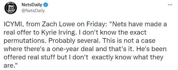 据扎克-洛维报道,篮网已经给欧文提供了一份真实的续约合同,但他不知道具体情况,只知道不是一份为期一年的合同。