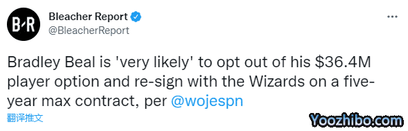 据名记沃纳罗斯基报道,比尔很可能拒绝3640万美元的球员选项,然后和奇才续签5年2.48亿美元的超级顶薪合同。